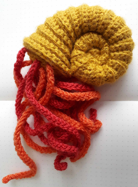 I made some mini sea creatures and shells for a yarnbombing display recently, and my little boy was sad to see the creations go. I promised him that I'd make some of his own for him to play with. His favourite was the ammonite shell. He has a little ammonite fossil that we found on the beach, and he loves watching this William Whiskerson video about fossil hunting. His favourite part is when they show the ammonite swimming along with its tentacles twisting and snaking around. So I decided to make him an ammonite with tentacles!